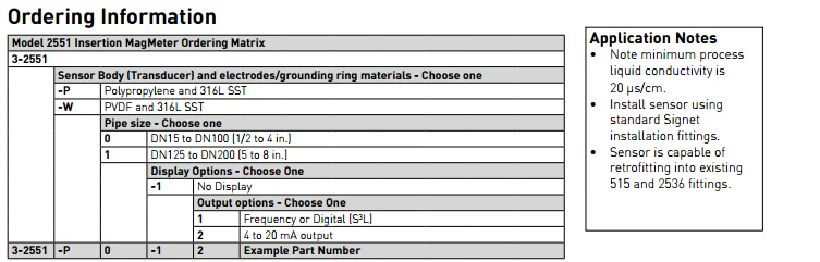 3-2551-P0-12 32551P012 Polypropylene and 316L Stainless Steel DN15 to DN100 (1/2 to 4 in.) No display 4-20 mA output