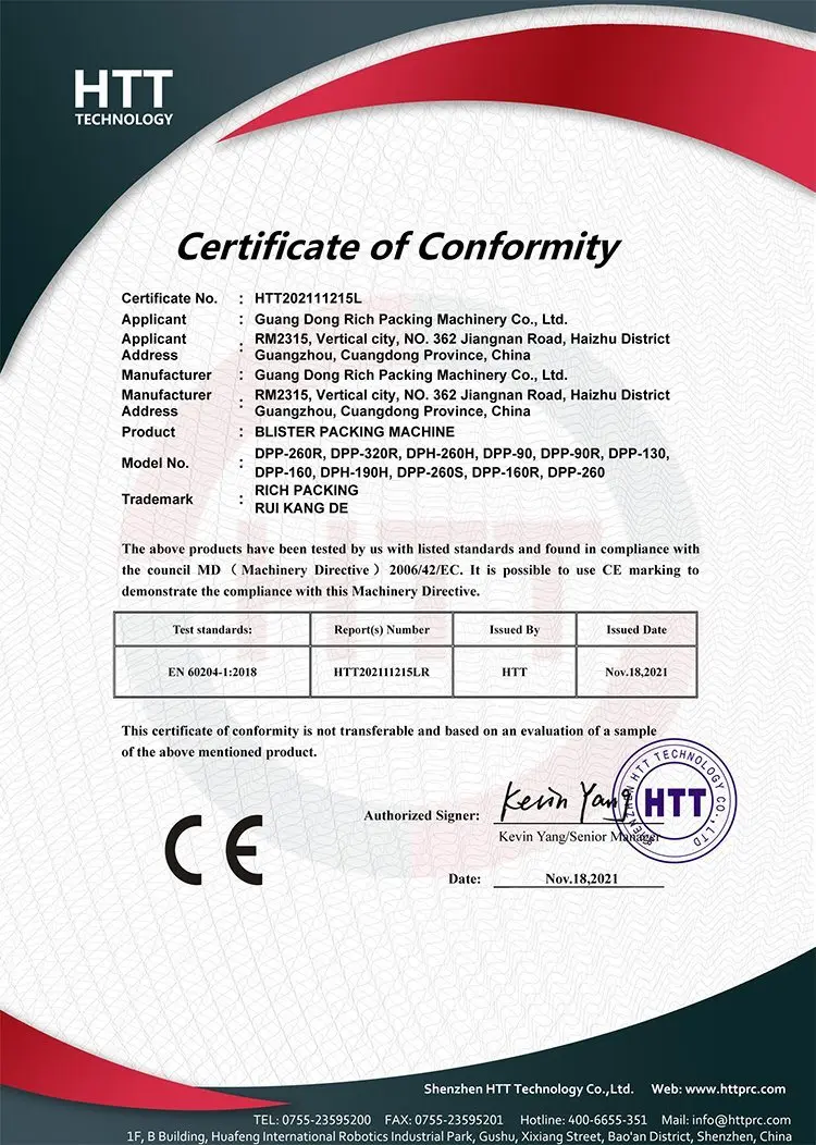 | Thickness and Width of PTP: | 260*0.02~0.03mm; | Thickness and Width of PVC: | 260*0.15~0.45mm; |