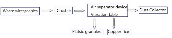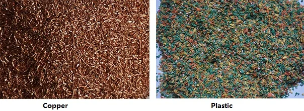 the principle :due to plastic and copper has difference in density,so the crusher need processing plastic first,then separated by vibrator and suction together.Finally the copper comes out from front side,the plastic comes out in other side.