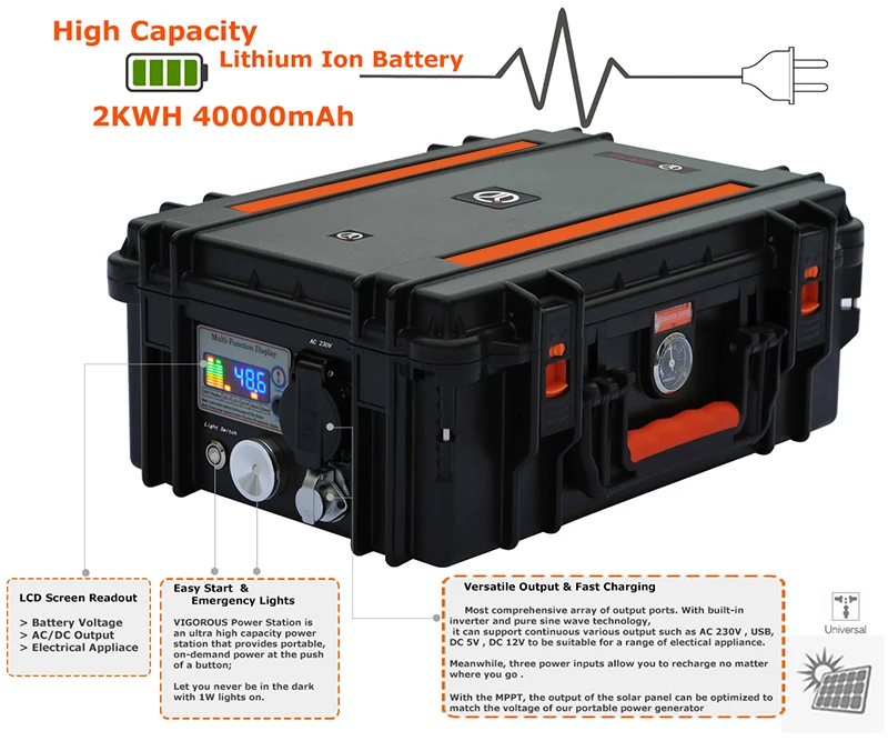HIGH CAPACITY&MULTI-FUNCTION: It can store 2000Wh(48V,40Ah) high capacity at one time and integrate multiple power ports, including 2 USB outputs,1 DC12V cigarette lighter output,1 pure wave sine AC outputs,widely used for indoor or outdoor such as family, office, travel, camping,emergency,fishing, hunting, farm or the job sites etc.
