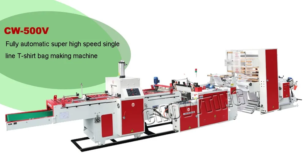 This is a practical high yield single line T-shirt bag making machine.Fully automatic operation,customers can effectively reduce the cost of investment and labor workforce.