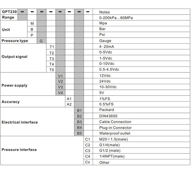 In order to meet different connection requirements, GPT230 has designed four electrical connections.They are DIN43650,cable connection,plug connection,packard.