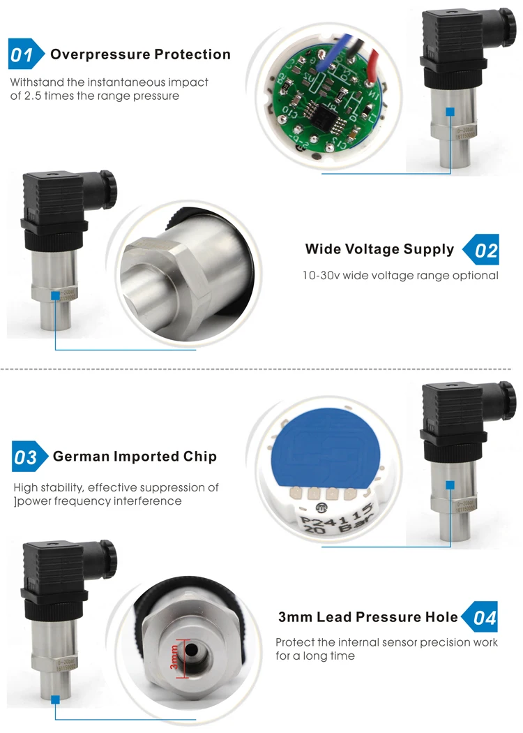 GPT230 pressure sensor is made of high quality stainless steel structure, the core and the pressure sensor chips are imported from Germany, the use of digital calibration and compensation technology, and passed the safety certification and CE certification.Widely used in compressor, automobile, air conditioning and other field pressure measurement.