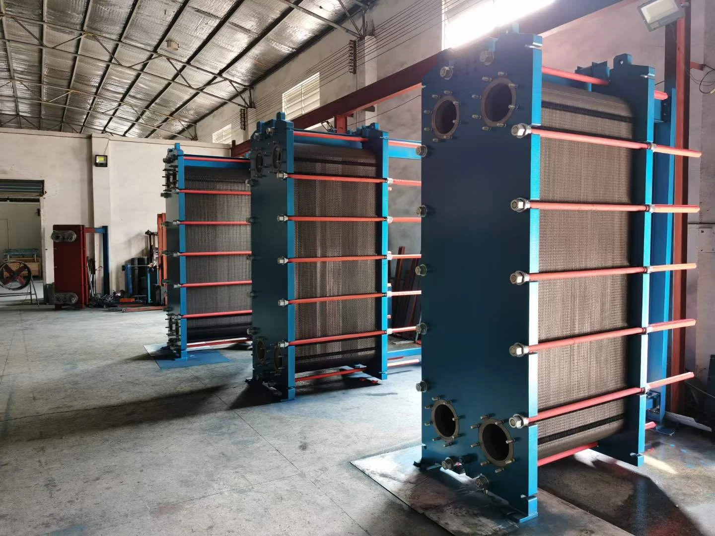 The detachable plate heat exchanger is composed of a group of corrugated metal plates with four corner holes. Two liquid (gas) bodies for heat exchange pass through. gold The plate is installed in a frame with a fixed plate and a movable pressing plate, and is clamped with clamping bolts. A sealing gasket is installed on the plate to seal the fluid channel and guide the fluid into their respective channels. The corrugated plate not only improves the turbulence degree, but also forms many support points, which is enough to bear the pressure difference between the media. The metal plate and the movable pressing plate are suspended on the upper guide rod and positioned by the lower guide rod, and the rod end is fixed on the