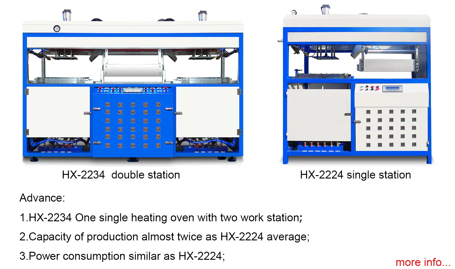 PLC touch screen control, HX-2224A a user friendly machine with the power and capability to form demanding shapes and materials. Rapid, energy efficient ceramic heaters with variable standby ,pneumatic table and clamping provides effortless operation, whilst the vacuum tank system fitted as standard facilitates ultra-fast response for demanding applications and fast cycle times.