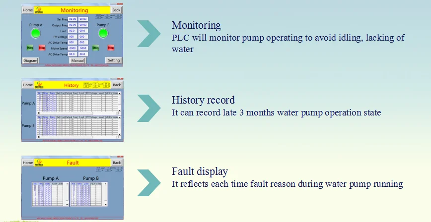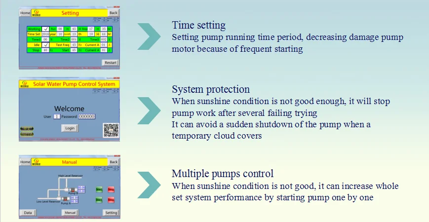 PLC control system is a optimization program designed and developed by Yaochuang Energy R & D team according to the operation characteristics of solar water pump system. It can improve whole system performance, reduce the loss of the pump due to external causes, increase the service life of the pump and enhance solar power system efficiency.