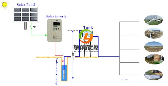 Solar PV array transfer solar radiation to DC electricity power, solar pump inverter adjusts input DC current, through inverter and frequency conversion, solar panel’s nonlinearity DC current become continuously output AC current for pump motor accompanying Max. power point tracking to drive AC pump lift water.