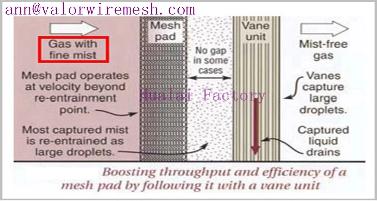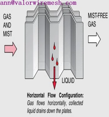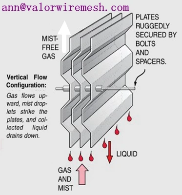 Vane arrays can be mounted horizontally or vertically. They are preferred in applications involving high vapour velocities, low available pressure drops, viscous or foaming liquids. slugs of liquids, or violent upsets, vane units are usually round or rectangular very similar to mesh pads. They are sometimes used in combination with mesh pads for optimum performance in special situations. Hualai standard vanes are available in metal or plastics and have various blade spacings. The metal vane profiles can be customized.
