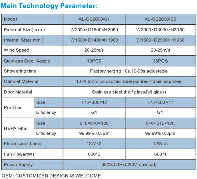 Air shower designed with Stainless steel combined punching air return plate, primary filter, 360 degree adjustable nozzle, the OMRON brand photoelectric switch