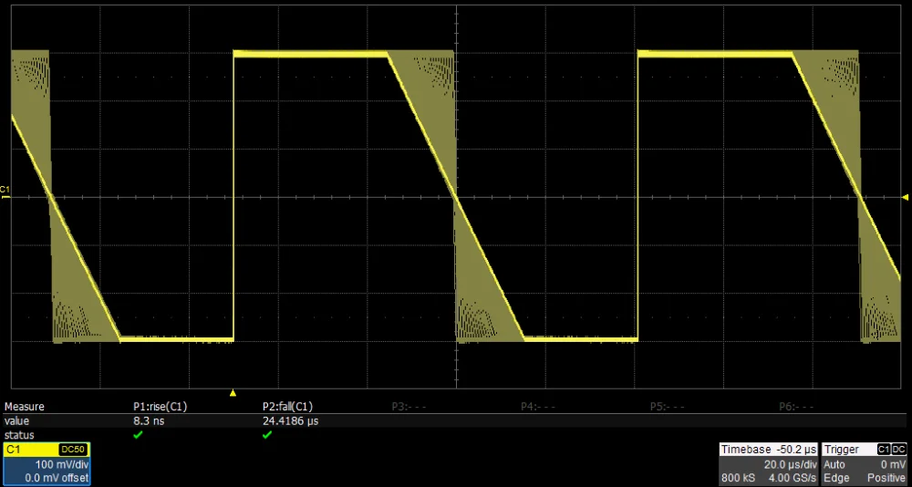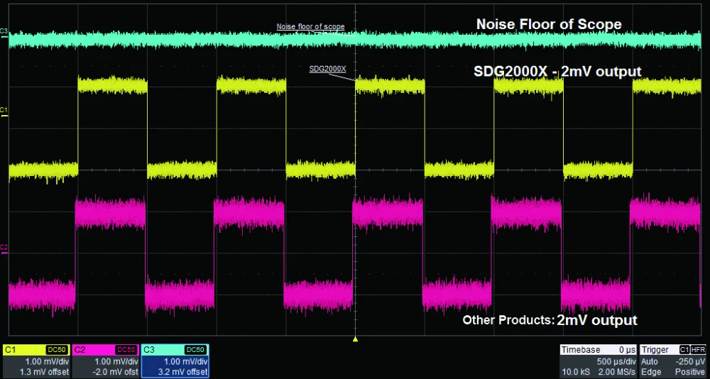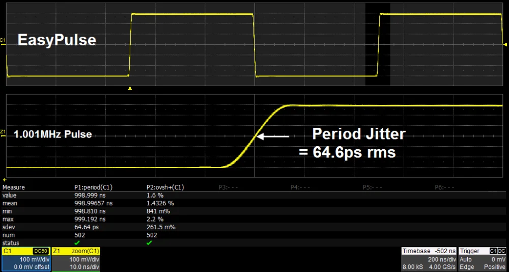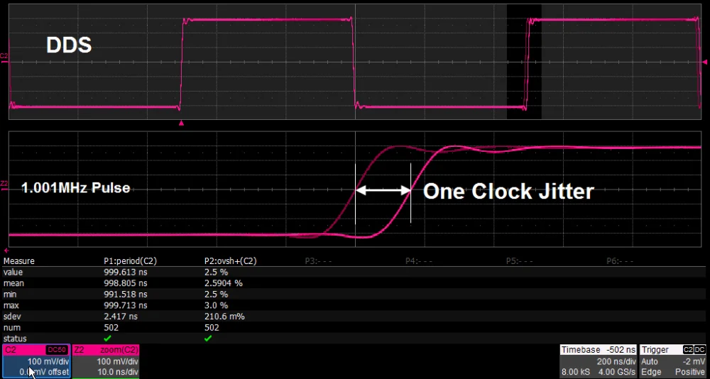 When a Square/Pulse waveform is generated by DDS, there will be a one-clock-jitter if the sampling rate is not an integer-related multiple of the output frequency. SDG2000X EasyPulse technology successfully overcomes this weakness in DDS designs and helps to produce low jitter Square/Pulse waveforms.