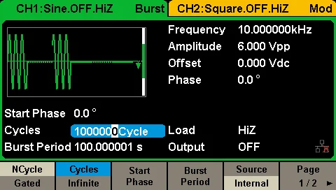 Two Burst mode: "N cycle" and "Gated” control. Internal and external modulation available.