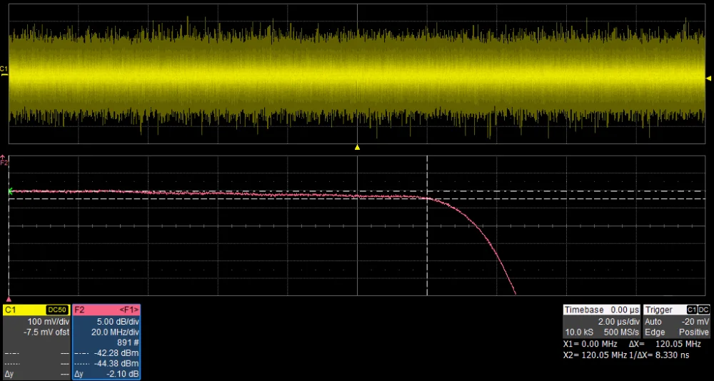 The bandwidth of analog channels proves to be greater than 120MHz, via doing a frequency response test with white noise.