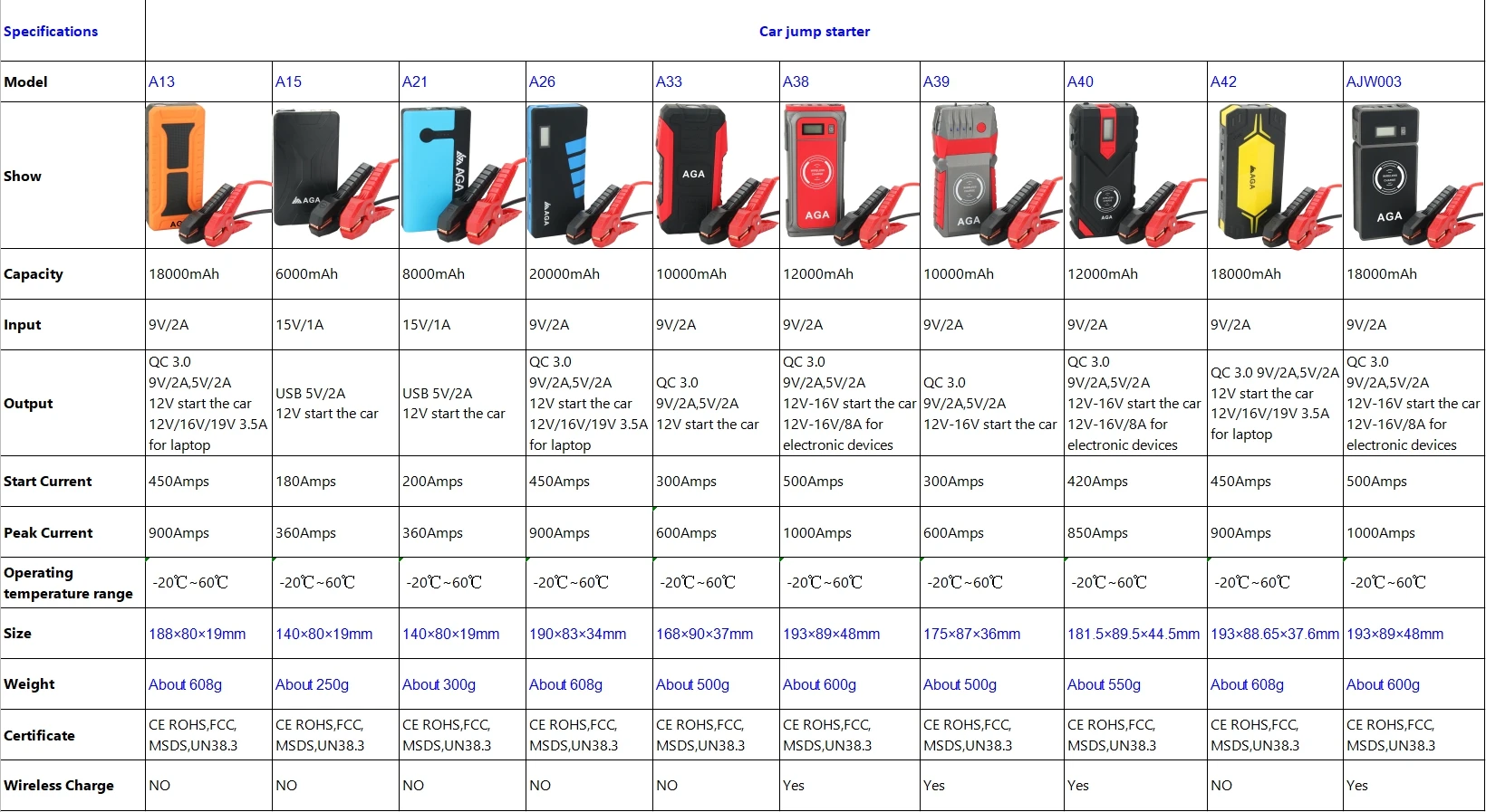 Package list | 1×Protable Car Jump Starter 1×Jumper Cable 1×3 in 1 Usb Cable 1×Carry Case 1×Car Usb Charger 1×Usb Adaptor 1×User Manual |