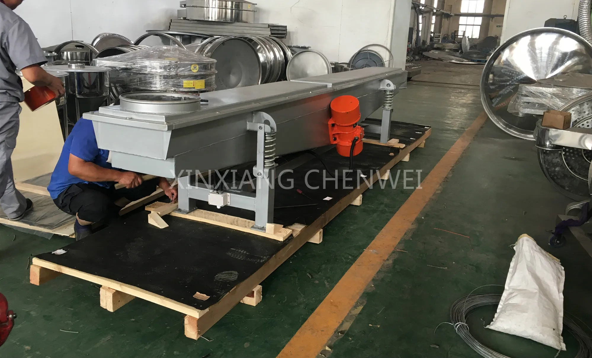 Vibration feeding machine uses double vibrating motors as power source,the exciting force will be generate when the two motors rotate synchronously and reversely. The exciting force drives the trough to vibrate. Due to vibration, the materials in the trough will move forward in a straight and saltatory movement and achieve the objective that feeding different kinds of materials. you can change the feeding capacity by adjusting the exciting force.The operation is safe and convenient for the operator.