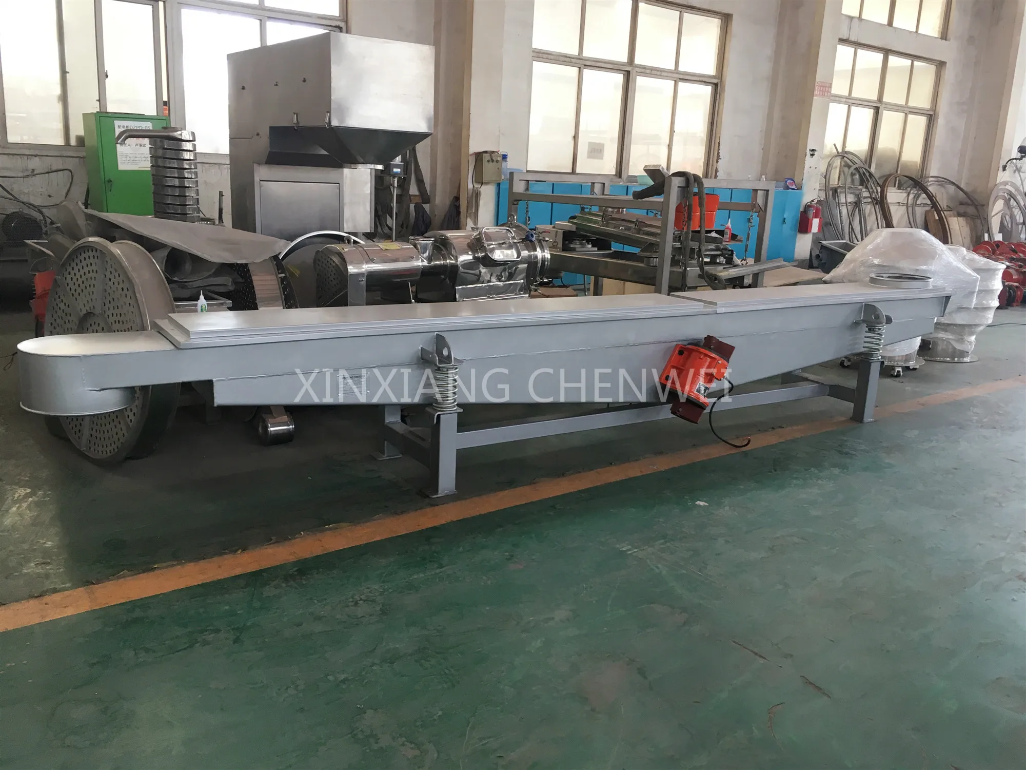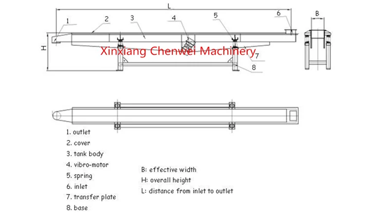 It is made up of inlet and outlet port, two horizontal vibration motor , transfer plate,supporting body, spring buffer, load -supporting base, and other parts.
