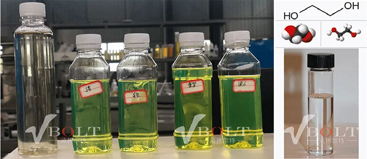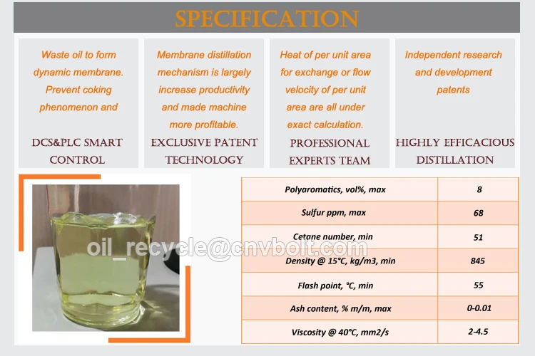 Being certified with ISO 9000:2000 and CE certificates, VBOLT researched VBT-DD advanced membrane distillation machine has been able to recycle used engine oil and other waste lubricant, tire pyrolysis oil and plastic pyrolysis oil into high quality diesel which can be used as fuel directly. It synthesized the advantages of traditional chemical treatment and distillation, and solved the problems as easy oxidizing and changing color. And it’s not as much cost as old generation molecular distillation.