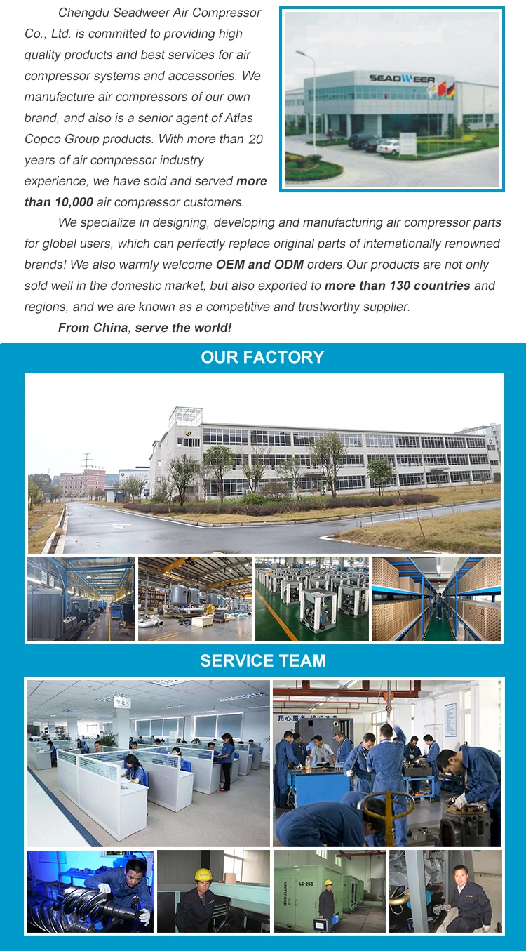 1.Are you factory or trade company? We are agent of manufacturer. 2.What's payment term? T/T, L/C, D/P, Western Union, Paypal, Credit Card, and etc. Also we could accept USD, RMB, Euro and other currency. 3.What is the scope of supply in your factory? 1. Air pressure system equipment: air compressor, air storage tank, pipeline filter, air dryer, nitrogen sparator, oxygen separator, compressed air pipeline, etc. 2.Mining and engineering machinery: drilling machine, rock drill, air pick, concrete sprayer, down hole impactor, etc. 4.How long is your Delivery Lead Time ? 1.If there is stock, we can arrange goods at once after we get the payment . 2.If need to be produced, 3-7 working days after receiving payment . 5.Can you accept customized orders? Of course. OEM and ODM customized services are very welcome in our factory. | ||||||||||