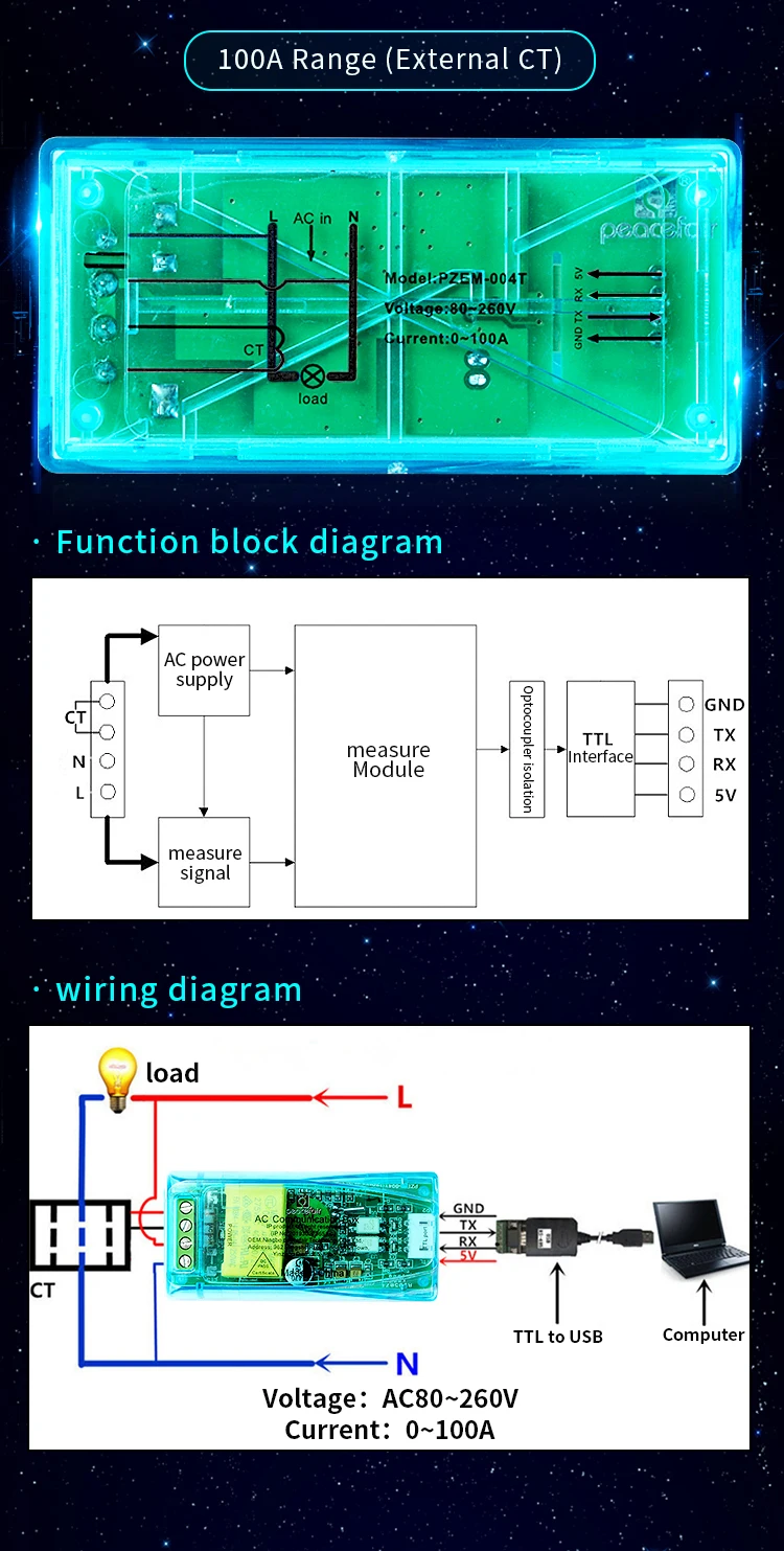 Function | the module is mainly used for measuring AC voltage, current, active power, frequency, power factor and active energy, the module is without display function, the data is read through the TTL interface. |