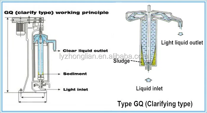Tubular centrifuge separator is high speed centrifuge with strong capacity. The main parts: machine body, driving part,bowl,liquid collecting pan, liquid-in bearing seat.The material is sprayed onto the bowl from the inlet on the bottom and strong centrifuge force is formed when the bowl rotates with the material and that makes the material flow upper along the wall of the bowl and then separated because of the different gravity by the centrifuge force. GQ-for clarification: Heavy solid is deposited on the inner wall of the bowl,and forms the sludge. And it will be discharged by manual after the machine stops. The clear liquid flows out of outlet from the top of the bowl.The motor connect with the big pulley and delivery the power to the spindle through the belt, tensioner and small pulley and rotate with the bowl in high-speed as the clockwise. |