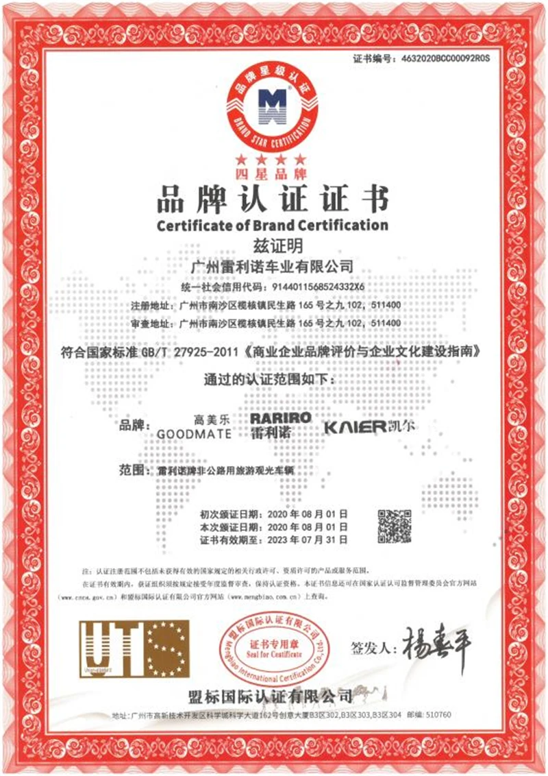 The company has owned 51 invention patents, 73 utility model patents, and 31 industrial design patents. It has successively obtained dozens of various certifications, qualifications and awards issued by the State Administration of Quality Supervision,Inspection and Quarantine of the State Administration of Quality Supervision, "Special Equipment Inspection Certificate of the State Administration of Quality Supervision, Inspection and Quarantine, etc.". Inspection certificate issued by Construction Machinery Quality Supervision and Inspection Center and Security Electronic Quality Inspection Center Subordinate products Public Security, Science and Technological innovation Police Award equipment in China,Guangzhou science and technology innovative enterprise Development Plan. It is also the drafting unit of China's new energy police electric motorcycle standards.
