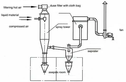 After air gets filtered and heated,it enters into an air distributor on the top of the dryer.The hot air enters into the drying room in a uniformly spiral form.Passing through the high speed centrifugal sprayer on the top of the tower,the material liquid will rotate and be sprayed into the extremely fine mist liquid beads.Through a very short time of contacting the hot air,materials get dried.The final products discharge continuously from the bottom of the drying tower and from the cyclones.The waste gas will be discharged from blower.