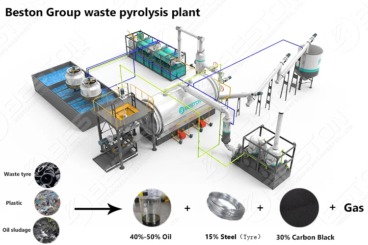Raw Materials | Waste Plastic, Tyre, Rubber, Oil Sludge | Φ2600*6600 | 42.4KW | Column tube water cooling | |||||