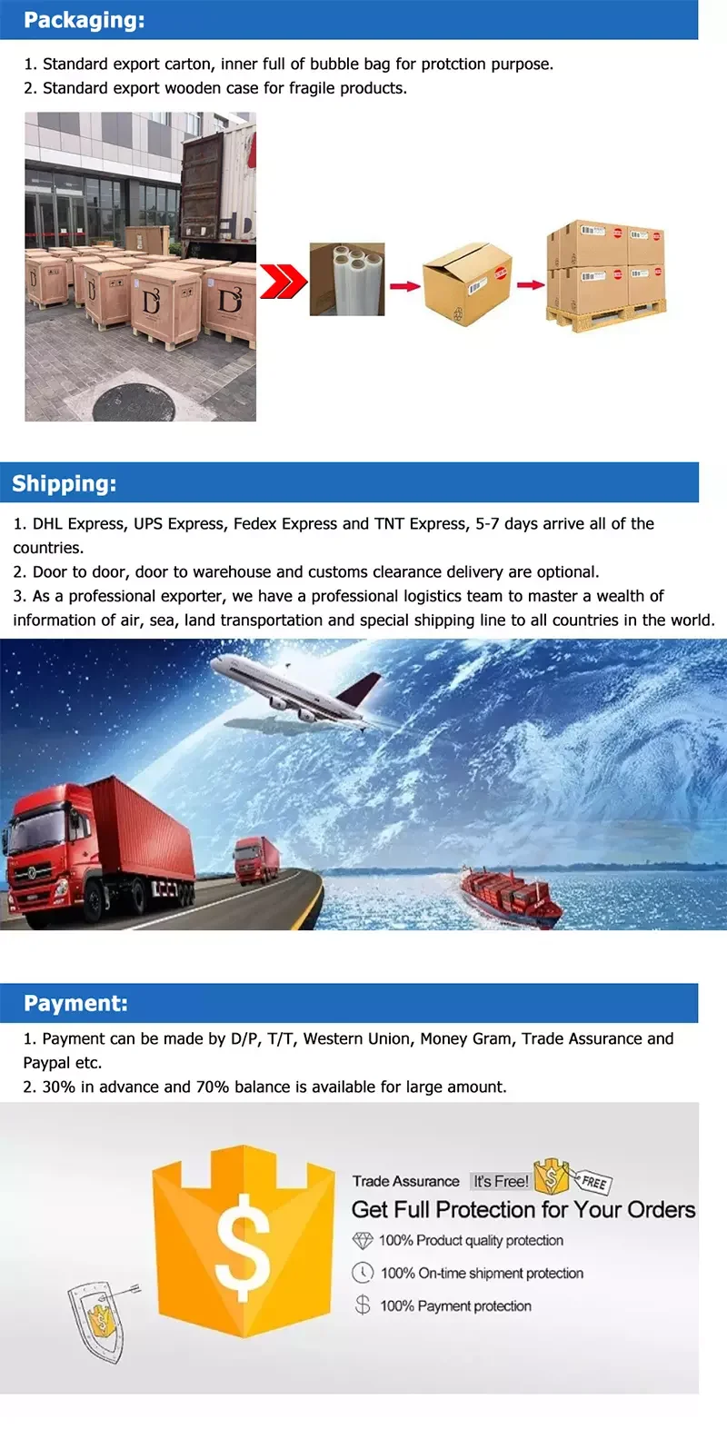 4. If you choose DHL, FEDEX,TNT,UPS, EMS, we will help you to arrange the shipment by international express and directly delivery to your address(DOOR TO DOOR SERVICE)! If the goods are delivered by express delivery, the buyer Only needs to pay the tax after the arrival