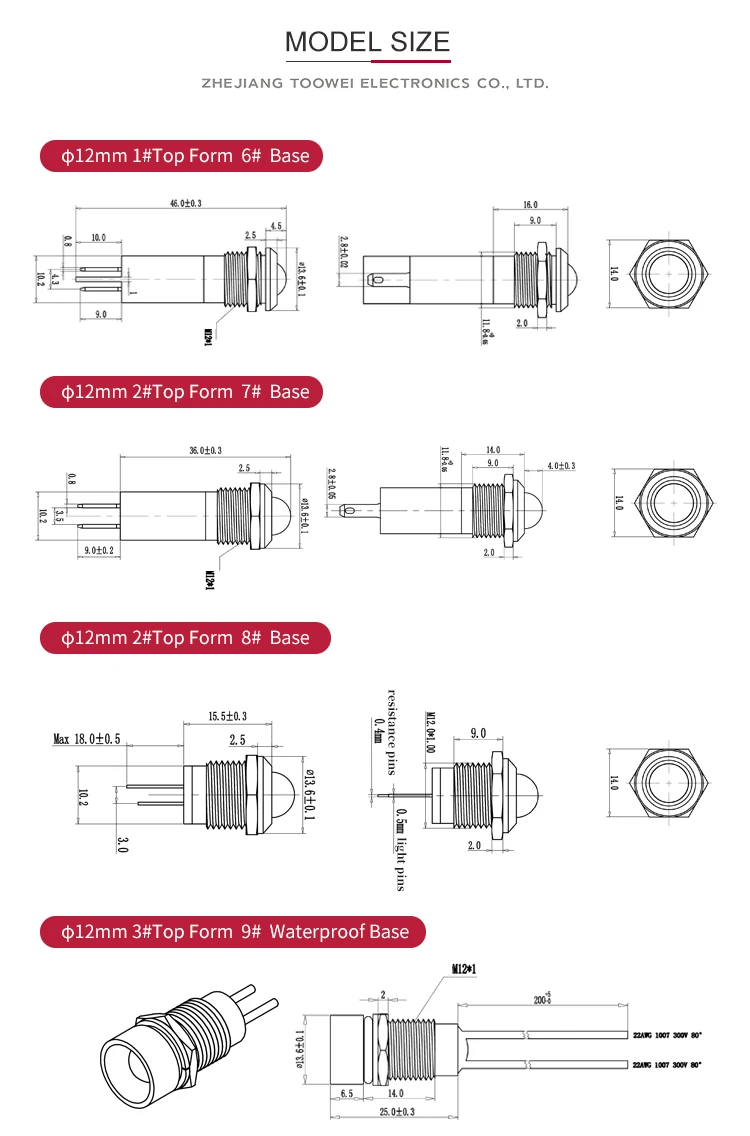 Brass alloy shell, surface electroplated bright nickel treatment, corrosion resistance, vibration resistance, impact resistance. High-brightness LED illumination, basic light color 5 (red, green, yellow, blue, white) other colors can be customized.Waterproof, oil-proof and dust-proof grade IP67 above the installation. Small size, exquisite appearance, economical andcost-effective. From the diameter of 6MM to 16MM specifications, rated voltage 2 ~ 220VDC, widely used in a variety ofelectronicand electrical equipment.