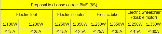 Take 10S36V as an example: what current BMS you choose is relied on your E-bicycle Motor power and current limitation of controller. eg., choose 16A for below 350W, 25A for below500W, 35A for below 800W, 60A for Below 1000W, higher than 1200W are contact with our service specialist for suggestions, one in all, continue current shall be higher than current limitation in Controller.