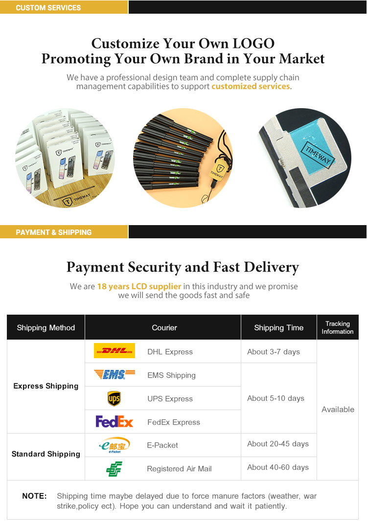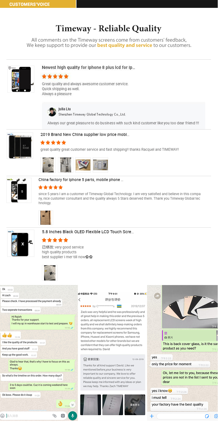 We are Timeway Global Technology,with factory based in Shenzhen,China,specializing in manufacturing mobile phone LCDs covering all models and spare parts including chargers,flex cables,batteries etc. Our customer spread all over the world. Top quality and best reputation in this industry.Wide range of products.Any thing you need we can provide for you whatever we got or find for you.Help you to save your money and time.Professional quality testing to ensure quality always the best.Do business with us ensure your money buy right Goods.