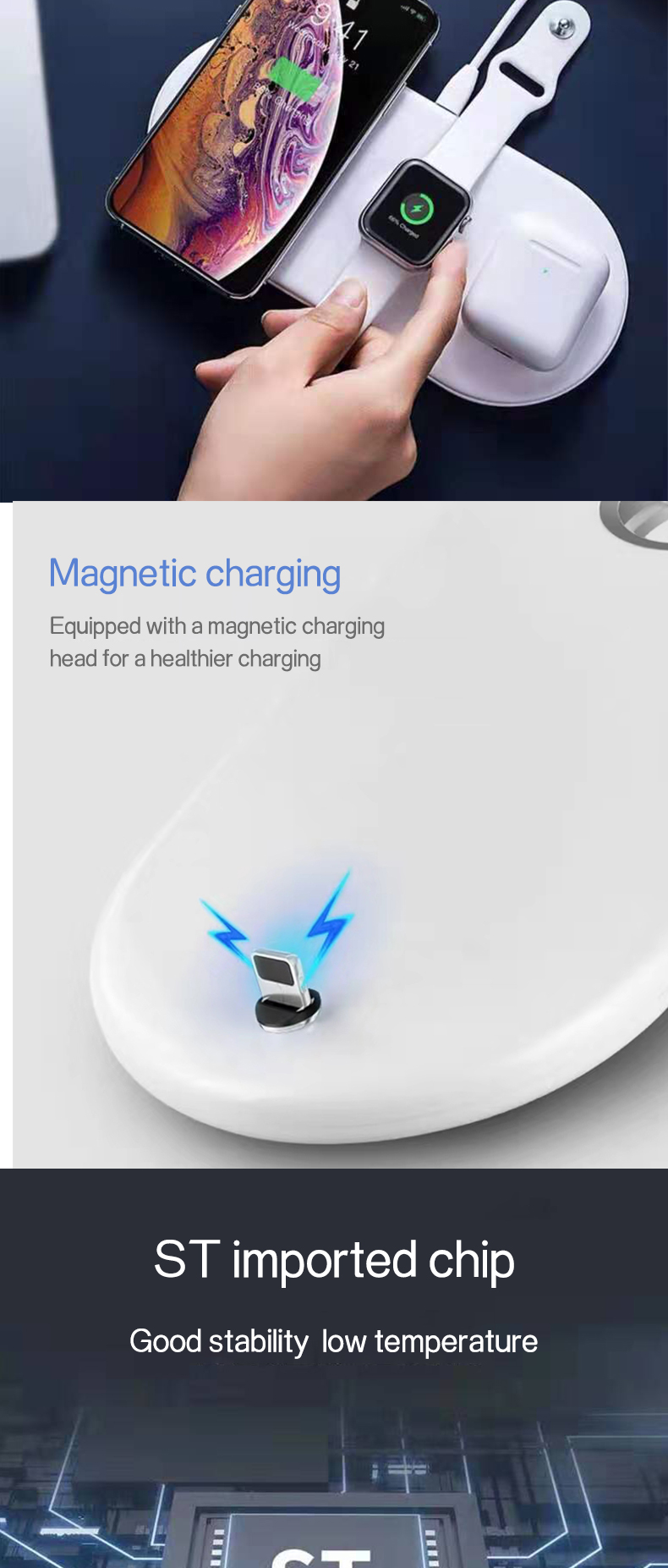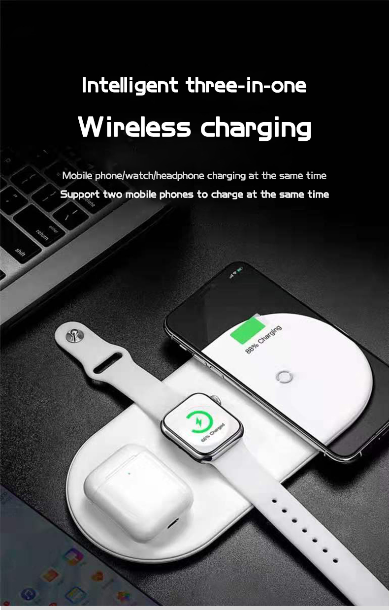 The new generation of wireless charging 3 in 1 has greatly improved the charging speed. It adopts a large coil design and supports Apple 7.5W fixed-frequency charging. Android 10W charging. The charging speed has increased by 50%. It can be increased in 30 minutes. 50% of the power, also provides full automatic power-off function, does not damage the battery, making charging more secure, widely loved by overseas wholesale customers, becoming the must-buy products for wireless charging in 2020