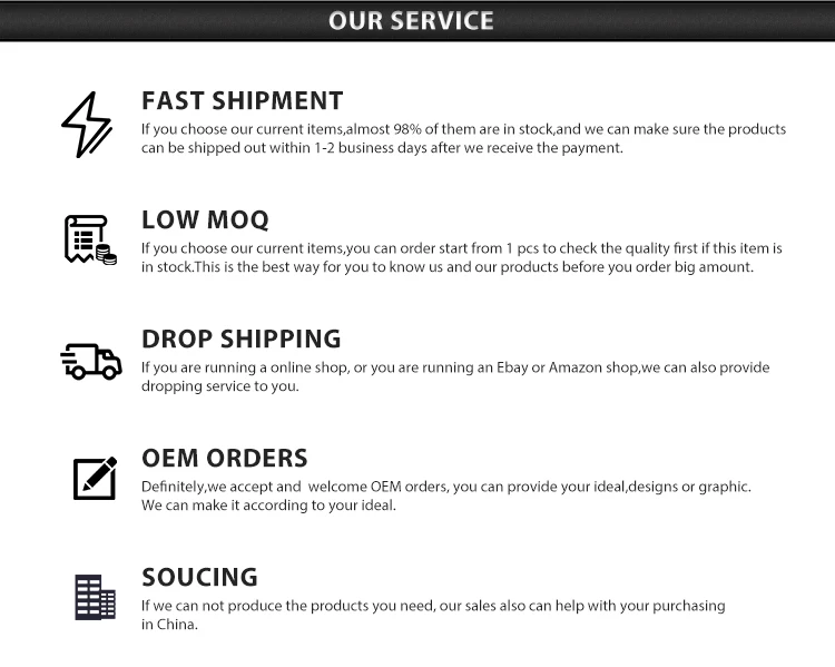 Our MOQ is 100 PCS for each item,but small trial order is OK.