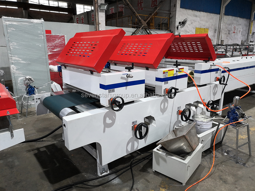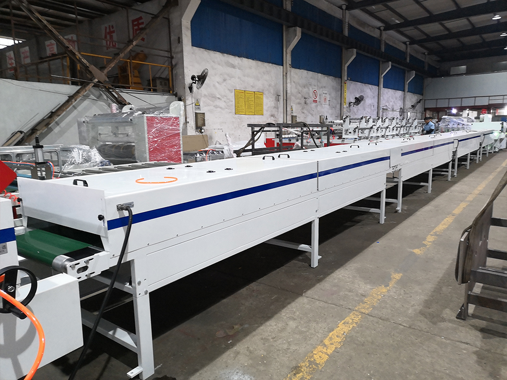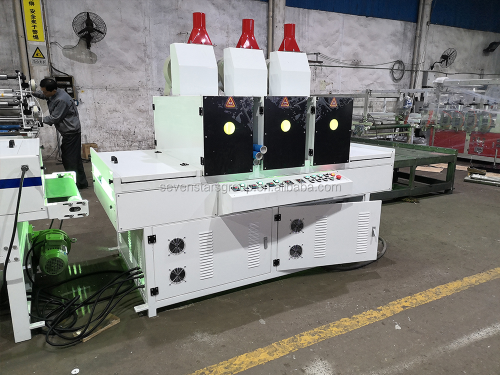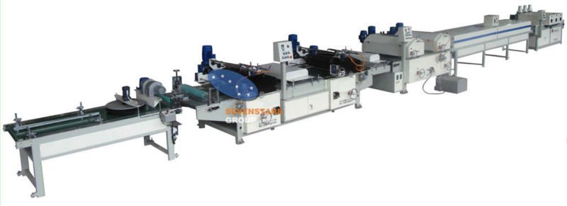 Transmitting&dust cleaning machine---Printing(1)---Printing(2)---three roller coating machine---Heating flattening---UV drying