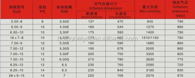 | Solid tyre | 4.00-8, 5.00-8, 6.00-9, 6.50-10, 7.00-12, 8.25-15, 8.15-15, 250-15, 300-15, 15*41/2-8, 16*6-8, 21*8-9, 200/50-10, 7.00-15, 7.50-15, 7.50-16, 8.25-20, 28*12.5-15, 32*12.1-15, 9.00-20, 10.00-20, 11.00-20, 12.00-20 etc. |