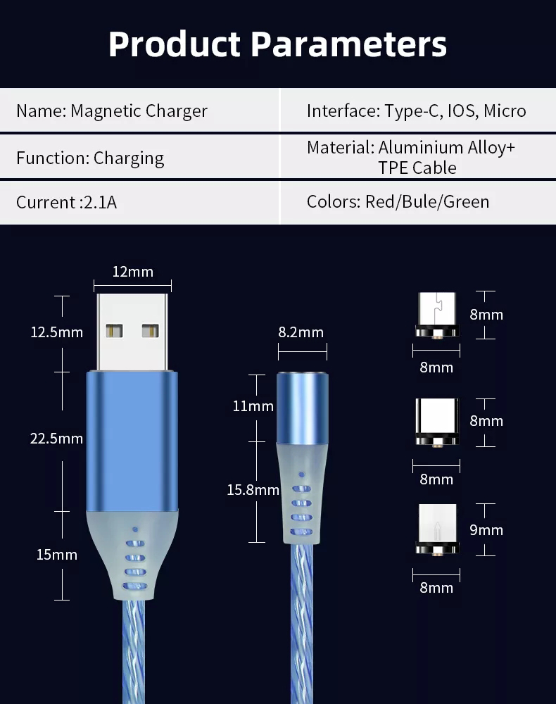 | Function: | Max 2.1A charge, LED flowing light, 3 in 1 magnetic design |