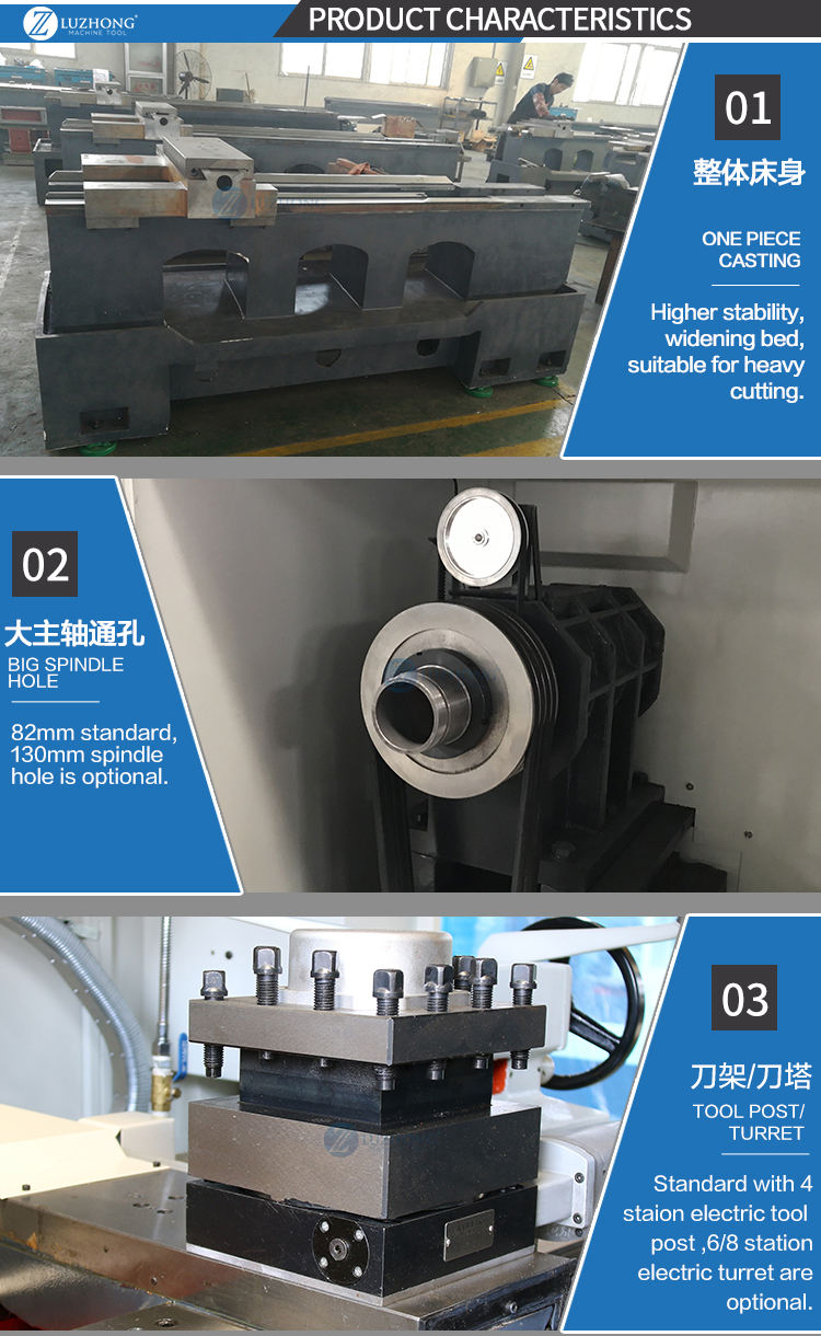 One piece casting, Guide way width 400mm GSK980TC3 control system Independent spindle 3 jaw manual chuck , Manual tailstock Electric 4 station electric tool post | Siemens or Fanuc control system , Hydraulic chuck, 6/8 Electric turret , Hydraulic tailstock , Double chuck as optional (130mm) Automatic chip conveyor |