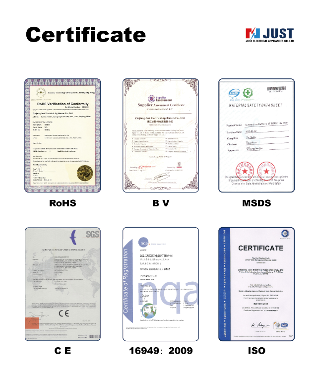 JUST has also passed ISO/TS 16949:2009,ISO 9001:2008,ISO 14001:2004,GB/T 24001-2004,CE,RoHS,and the International Quality Control System Attestation.