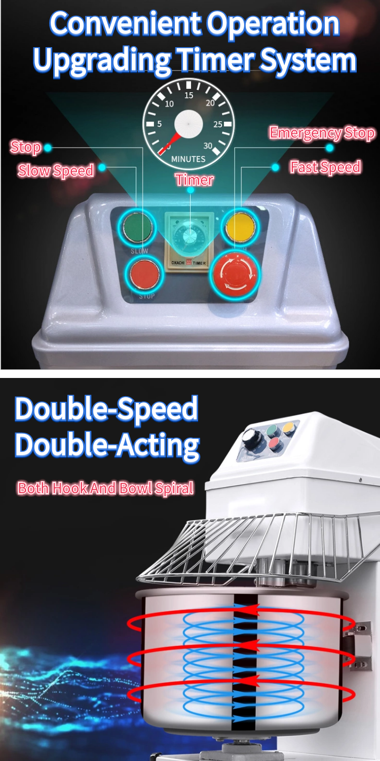 R&M Spiral mixers can imitate hand-kneading and rolling motions.The process of mixing with a spiral hook incorporates the more than double the amountof air into the dough, giving you a light and airy product simulating kneading the dough by hand.