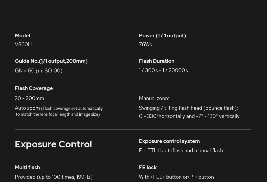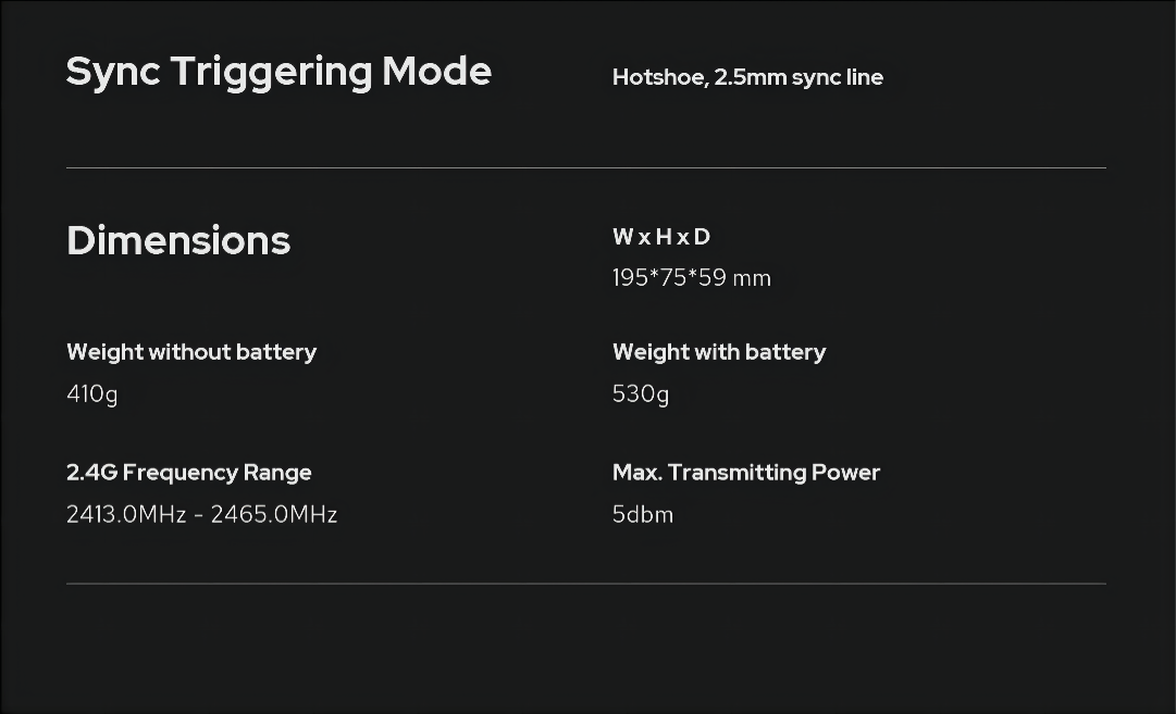 | Sync Mode: | High-speed synchronization (up to 1/8000s); | Flash Duration: | 1/300S-1/20000S; |
