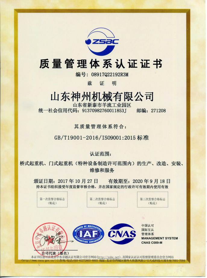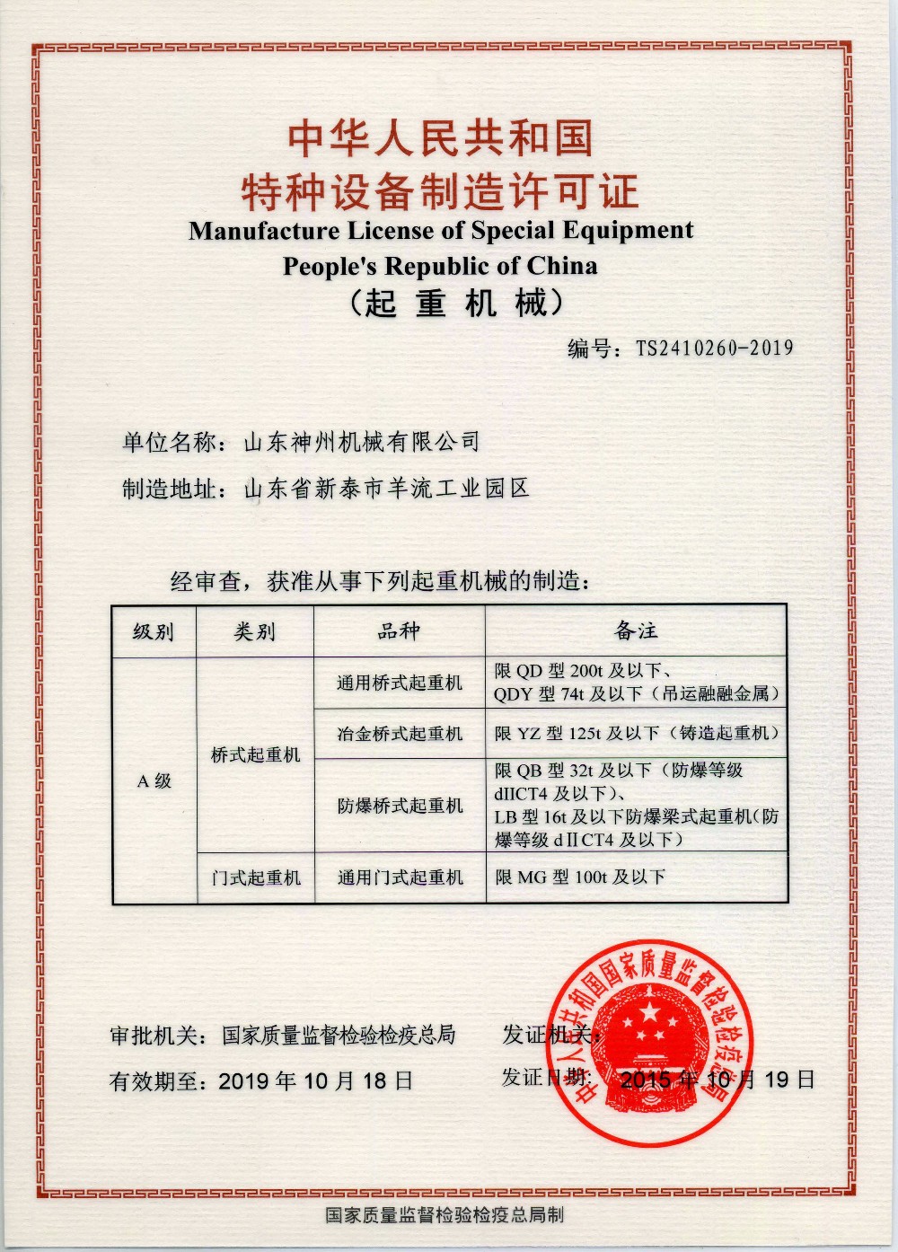 Shandong Shenzhou Machinery Co., Ltd. is located at the foot of Mount Tai, the hometown of Yang Hu. It is a professional manufacturer of modern cranes. It has the special equipment manufacturing, installation, transformation and maintenance license issued by the General Administration of Quality Supervision, Inspection and Quarantine of the People's Republic of China.The company was founded in 1989. Its predecessor was Xintai Crane Factory, which was restructured in 2005.Over the years, the company has continuously introduced advanced production technology at home and abroad, and absorbed professional and high-quality professionals. The company has strong technical force, advanced process equipment, professional engineering and technical personnel, first-class installation team, and excellent after-sales service. The ISO9001 international quality system certification, with independent intellectual property rights and industrial property rights.With ten series of more than 60 varieties and the production capacity of various non-standard lifting equipment, the products sell well in more than 30 provinces and cities in China and more than 10 countries and regions.