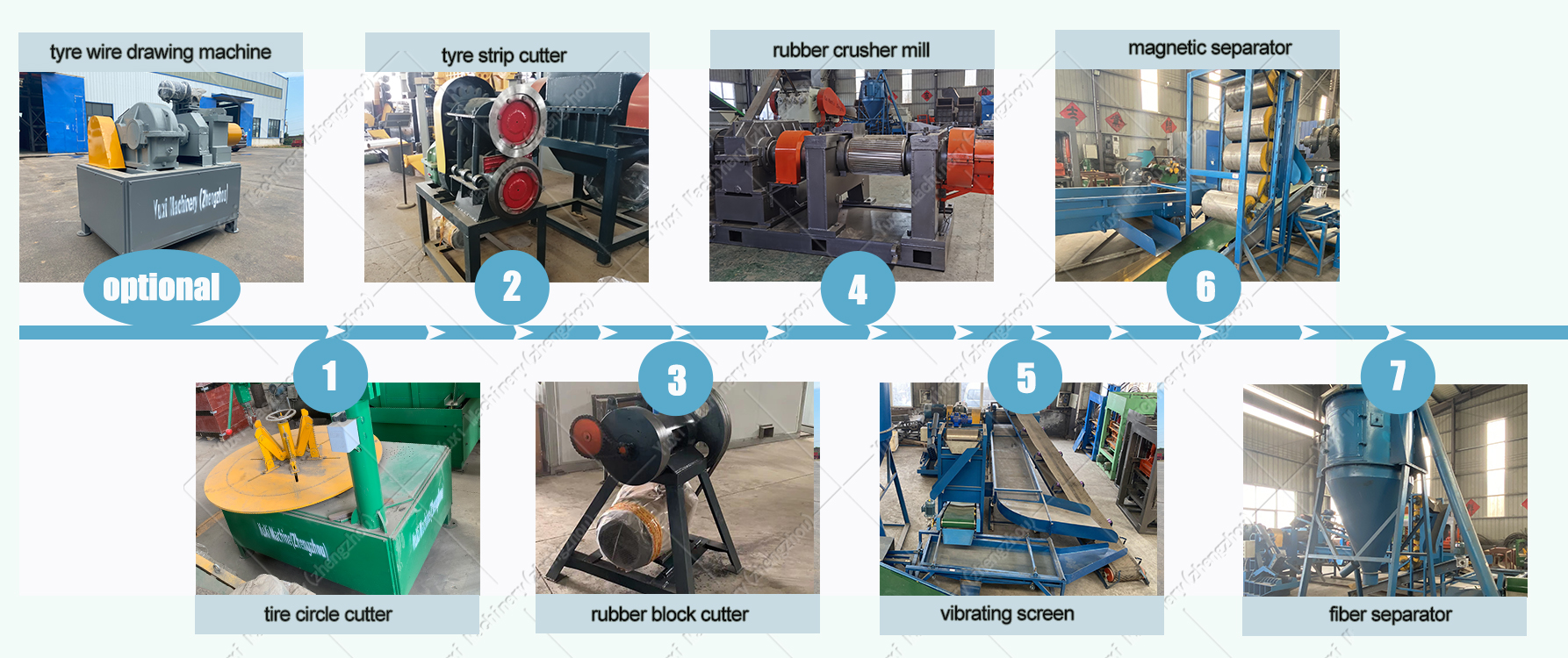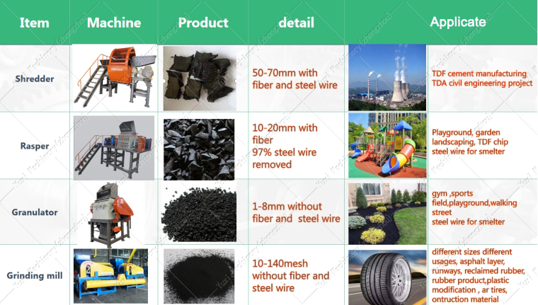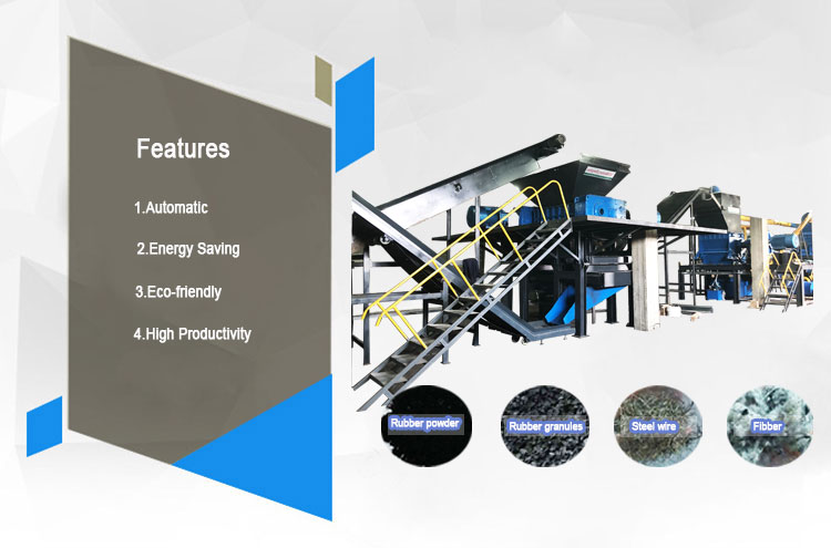 complete separation | Rubber chips, steel and fibers can be automatically separated. Using PLC control system, only 4-6 people can operate a tire recycling (pellet) production line with a capacity of 3000kg/h. Low energy consumption. 3000kg/h tire recycling production (granule) line installed powder is about 800kw. | ||||