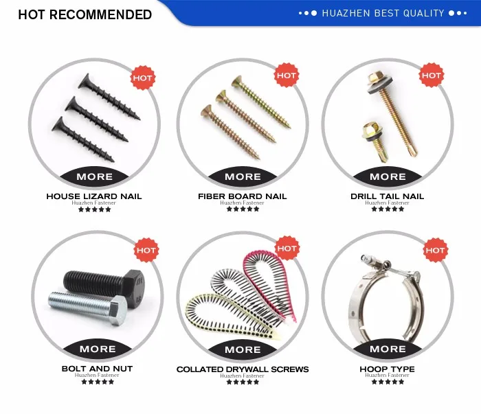 We also have other screws and nails for you to choose from:Particleboard screws, drywall screws, self-tapping screws, self-drilling screws,hesagon head wood screws, screwdriver bits, common nails,blind rivet, Square Boat Nails, Cutting Masonry Nails, Plastic/Metal Cap Nails, Plastic/Paper Nail Nails, L Head Skid Nails, Staple Nails, ST/FST/WT Nails, F Brad Nails, Concrete Steel Nails, Air Nails Nails, Sod Nails, Fence Staples,roll nails,Roofing Nails, Roofing Nails with Umbrella Heads, Pallet Nails, Roofing Screws, Duplex Nails, Brad Nails, Bolts, Nuts, Metal Washers.