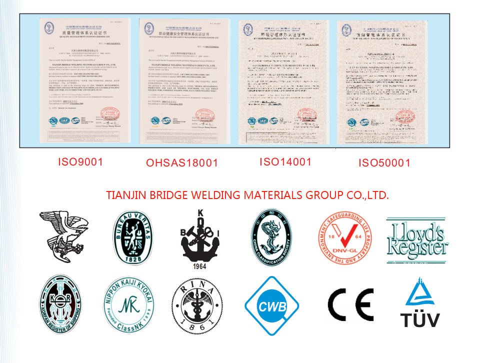 Tianjin Bridge Welding Materials Group Co., Ltd. has a history of 64 years and an annual production capacity of 1.5 million tons. "Bridge" is the first well-known trademark in China. Furthermore, we areThe first welding rod factory in China. The first company to export welding consumables. The first company in China to obtain all shipping association certificates. China's largest manufacturer of integrated welding materials.Has a number of professional certificates: ABS/BV/CCS/CWB/DNV-GL/NK/KR/LR/BKI/NAKS/JIS/CE/DB/TUV, ISO, etc.