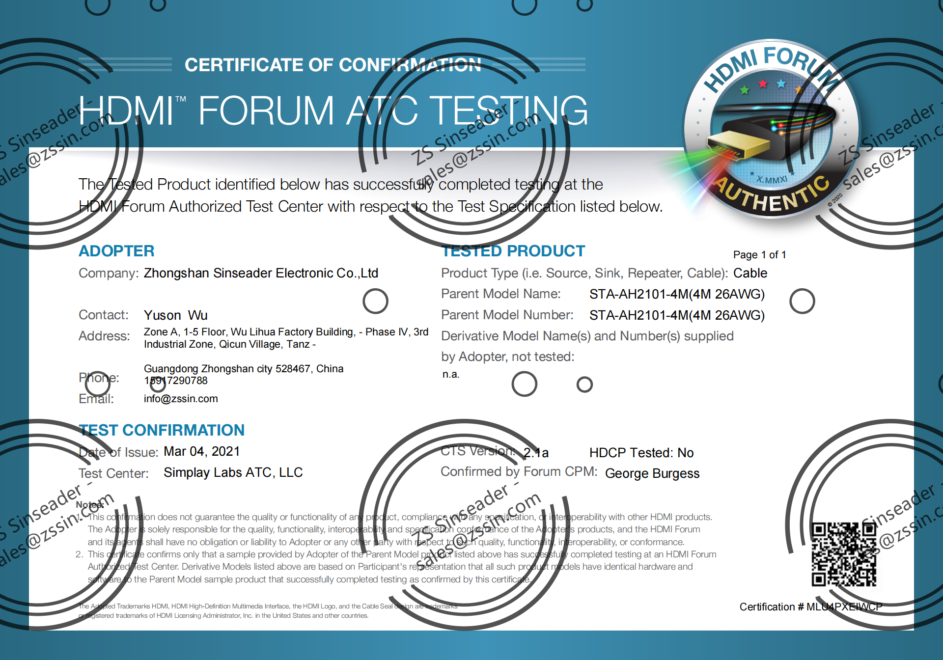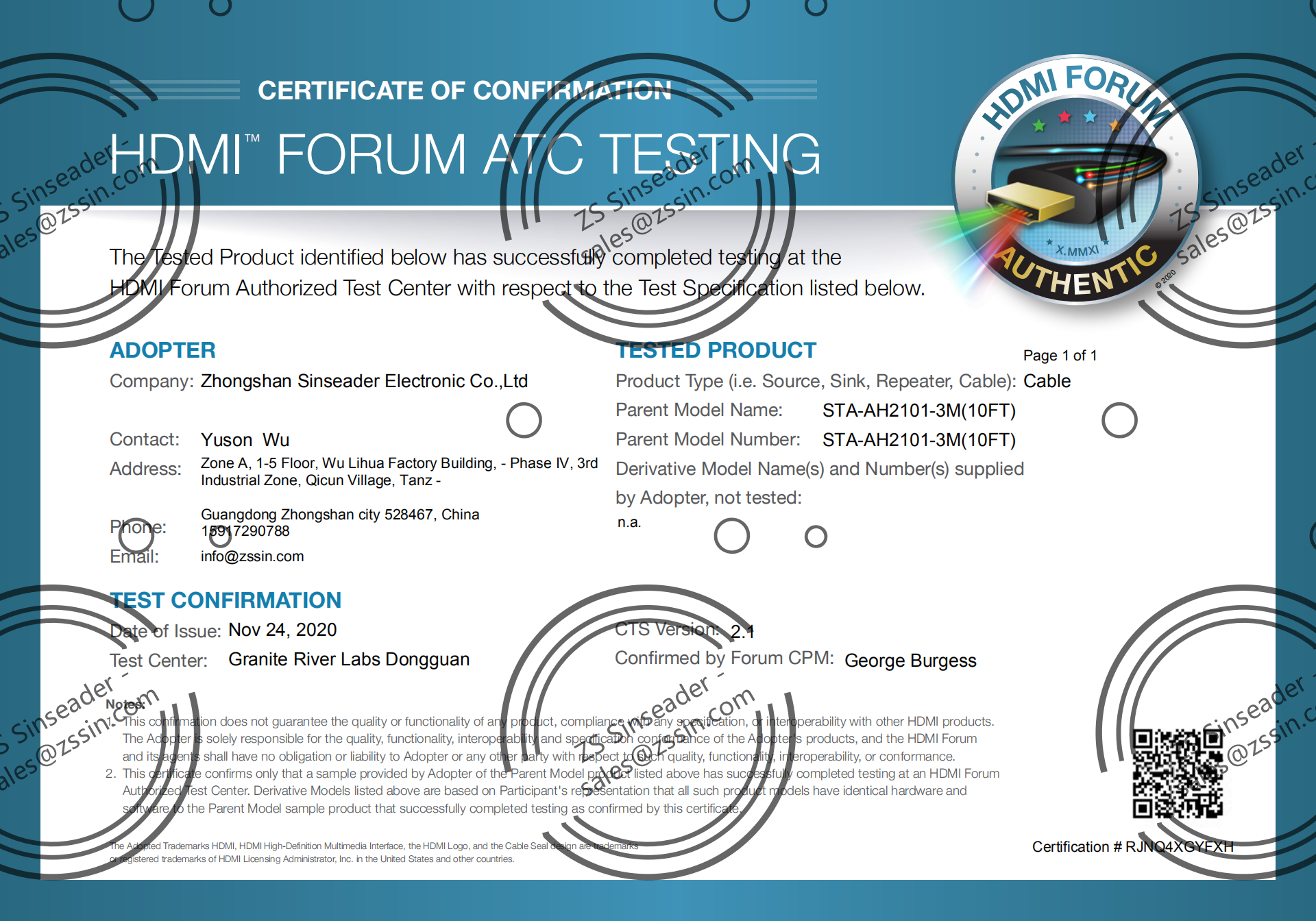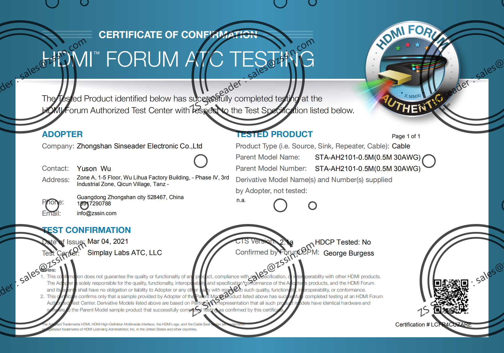 | Certificate: | HDMI Adapter, ATC, TDR |