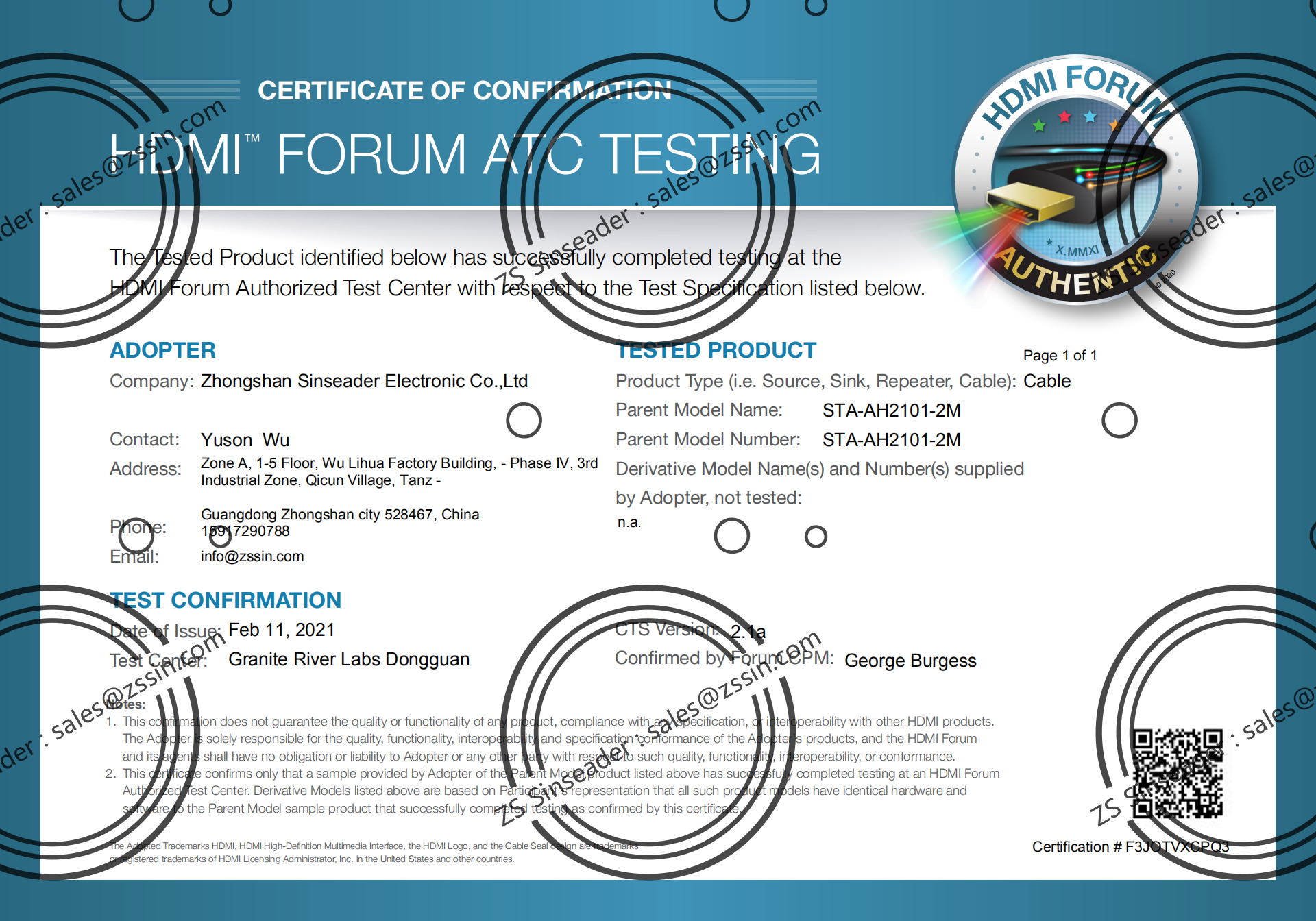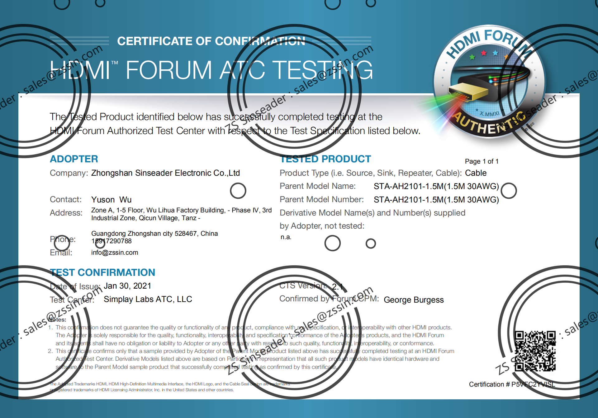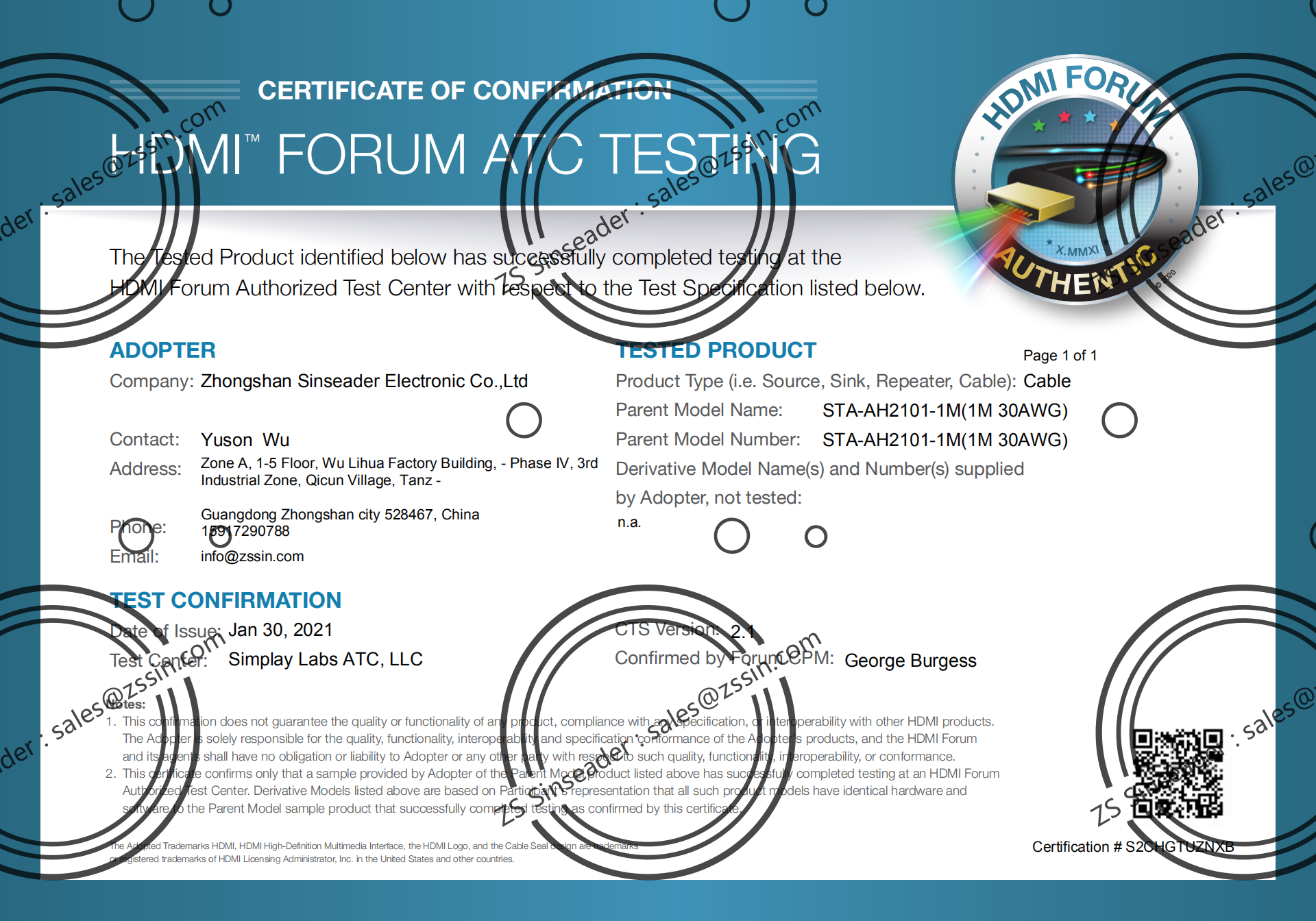 | Certificate: | HDMI Adapter, ATC, TDR |