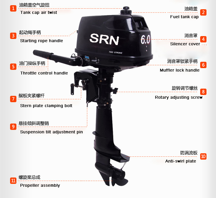 1. 10 hours before the new machine belongs to the running-in period. New machines need to be added to the 4-stroke oil for the outboard. Please refer to the instruction manual for oil quantity (connect the oil pipe, the oil pipe arrow is connected to the upper end of the oil pipe, loosen the vent on the fuel tank cover. Put the bolt, pump oil, propeller and water inlet into the water, the gear is in the neutral position, pull out the choke valve, insert the The red flame rope starts the engine and pushes the choke back immediately after the machine starts.