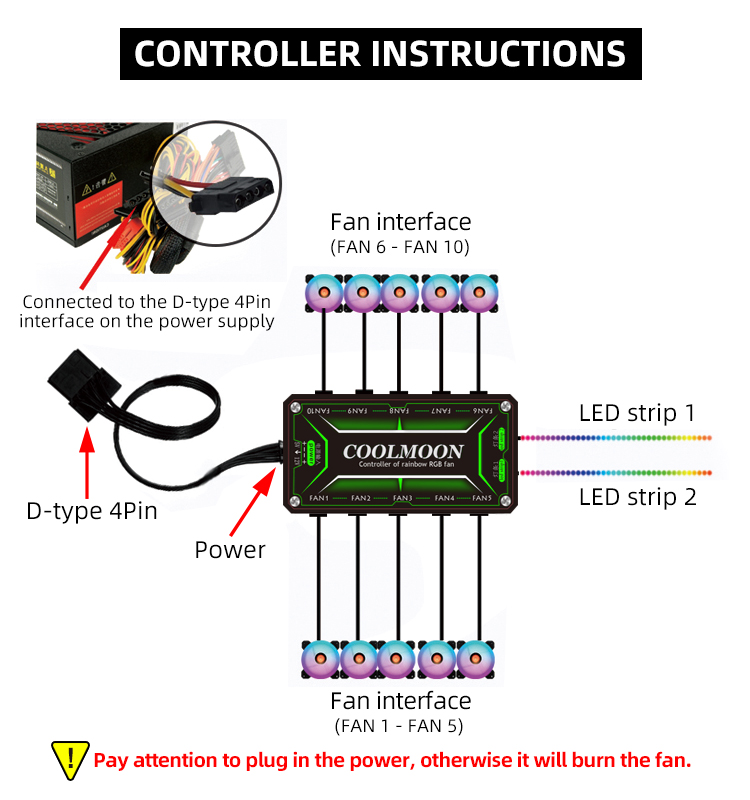 This controller only supports this brand of RGB fans, not compatible with other brands of fans, including 1HUB+1remote+1wire, supports 10fan+2 light strips