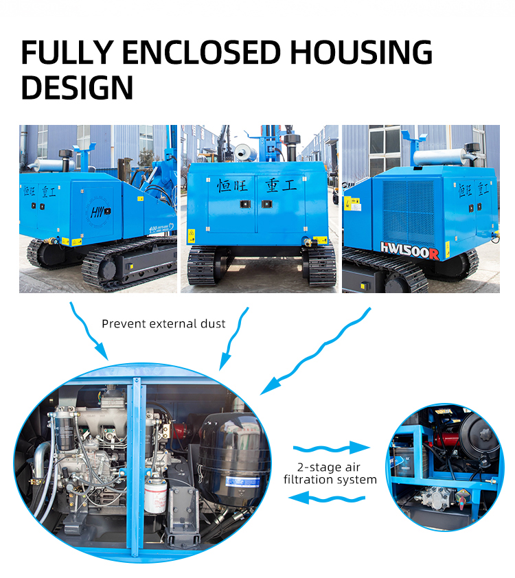 3.Centralized operation and control platform, the operation is simpler and more convenient | 4.The pile driver is equipped with a large power head, and the size of the pile cap can be customized. | 5. In addition to piling, the machine can also be connected to the air compressor for drilling |