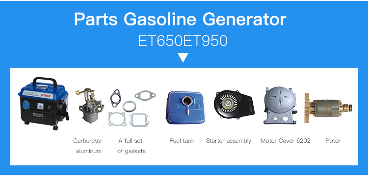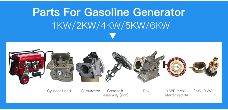 Recoil starter, crankshaft, spark plug, shroud cylinder, magneto, high voltage group, fuel tank, exhaust pipe, starter cover, overload protector, carburetor, stator, rotor, fan, fuel filter, voltmeter , plugs, sockets, sockets. The rear of the frame, capacitors, flywheels, pistons, piston rings, etc.