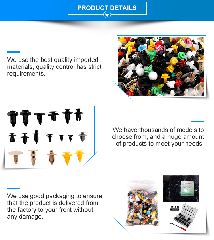 | Packaging Details: | 1.100/200/500 pcs in plastic bags 2000, 0 pcs and 27kg 2. Carton packing can also be according to customer's request 3. Carton size: 50*26*60cm 4. Carton weight: 2kg | product name: | car clip fasteners |